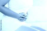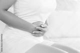 Young woman having painful stomachache sitting on sofa at home. Chronic gastritis. Abdomen bloating concept.