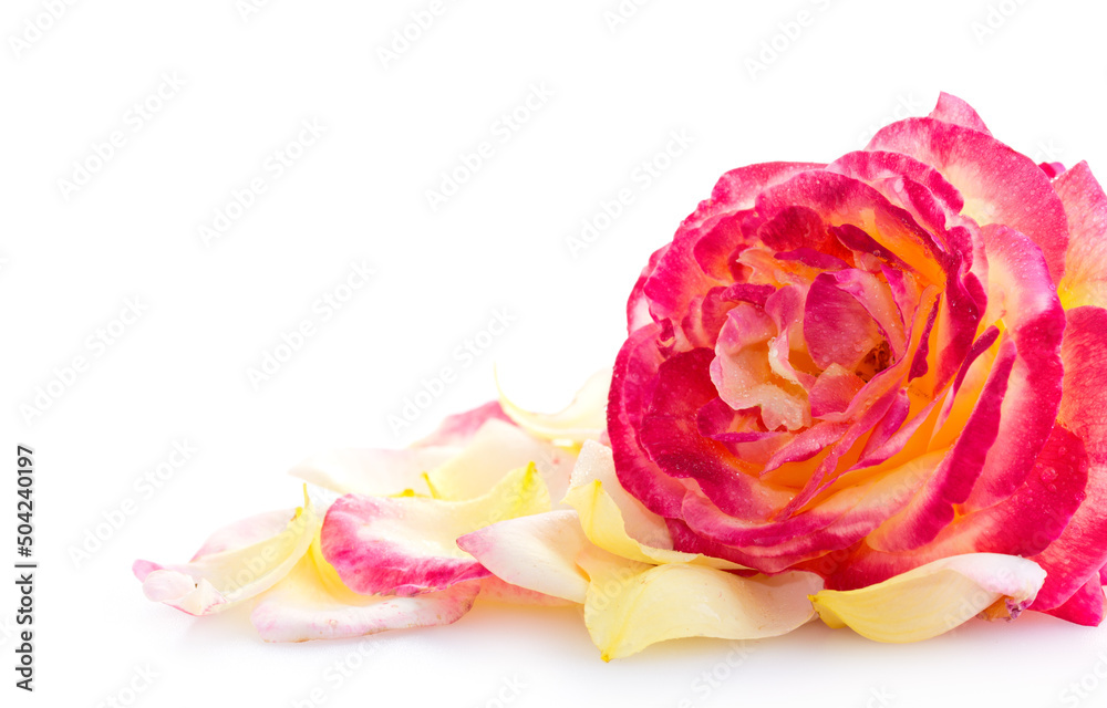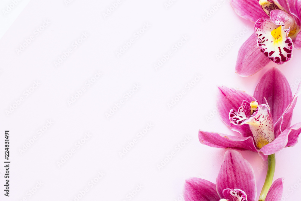 Spa and wellness setting with orchid flower, oil on wooden white background closeup top view