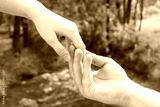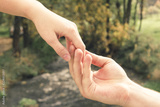 Mans hand gently holding the female against the background of the spring stream, concept of love and Valentine day
