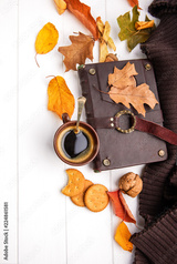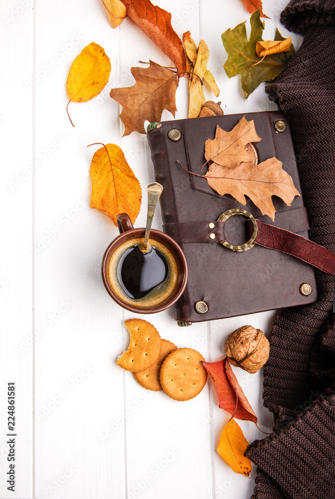 Autumn fall still life cup coffee yellow leaf book warm scarf