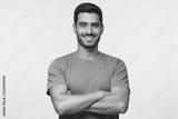 Portrait of smiling handsome man in blue t-shirt standing with crossed arms isolated on grey background