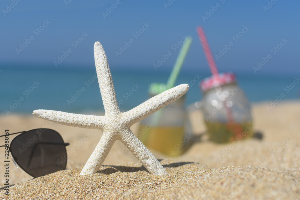 Cold refreshment on sandy beach. Summer holidays background, concept of vacations