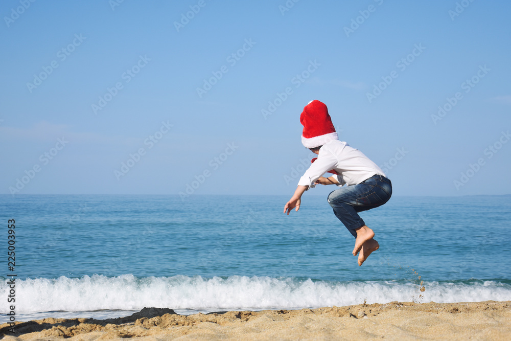 Happy child with Santa hat play at sandy beach. Little boy wait a new year on beach