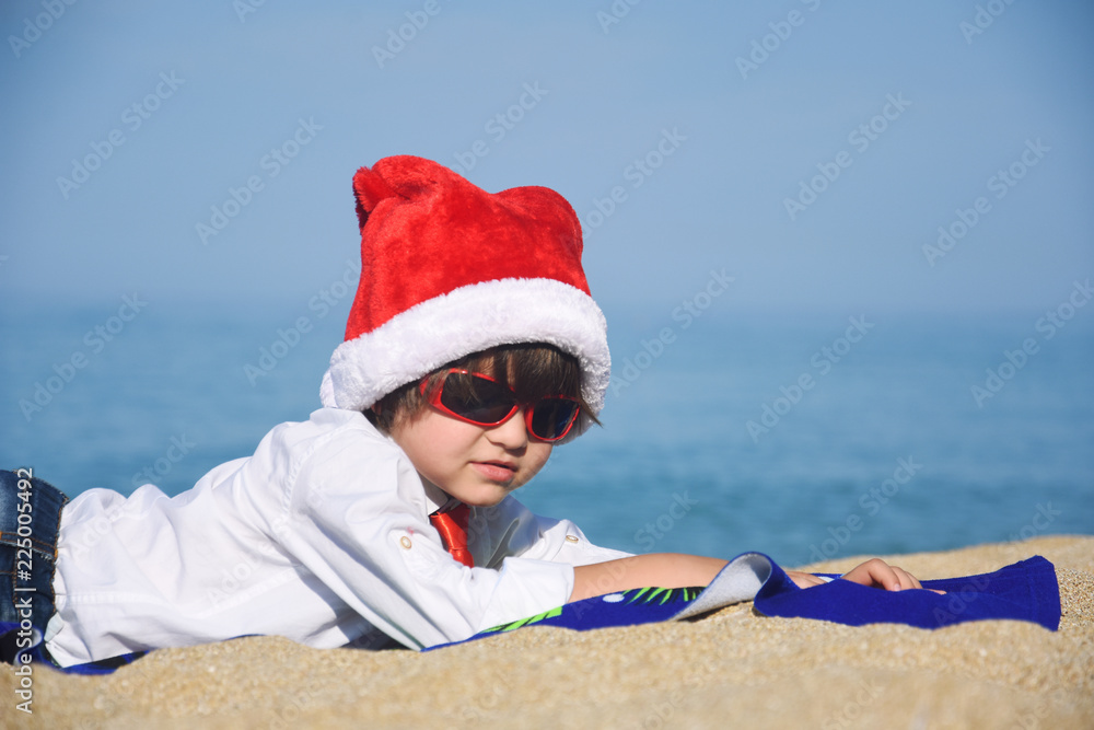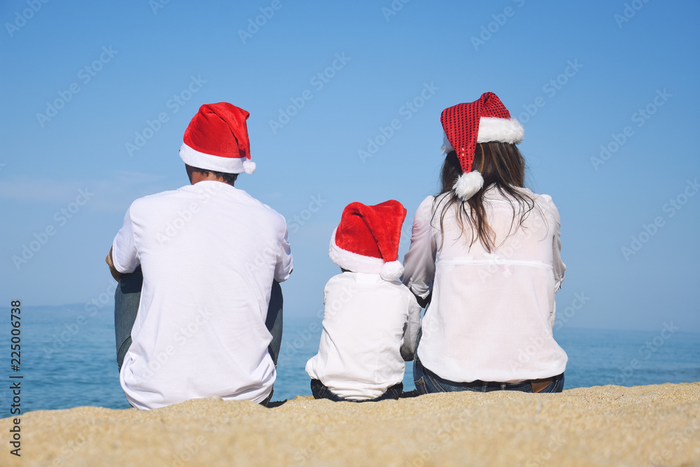 Happy family in Christmas Hats having fun on sandy beach. New Year holidays concept