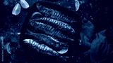 Grilled sardines with thyme, chili and lime wedges on cast iron skillet
