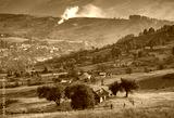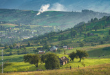Carpathian village on a mountain hill at sunset time