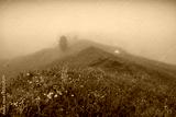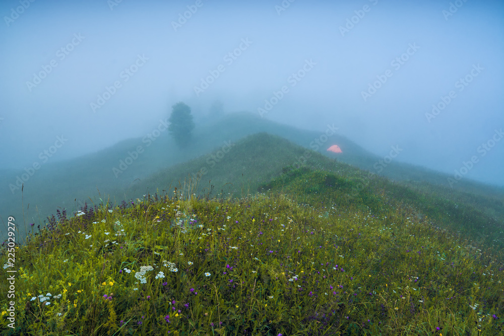 Mountain hill covered with fresh green grass and flowers