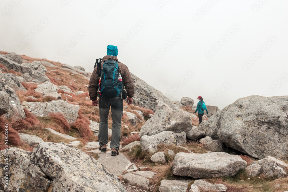 Two tourists guy and girl climb to the top of the mountain on the rocks among the grass and fog