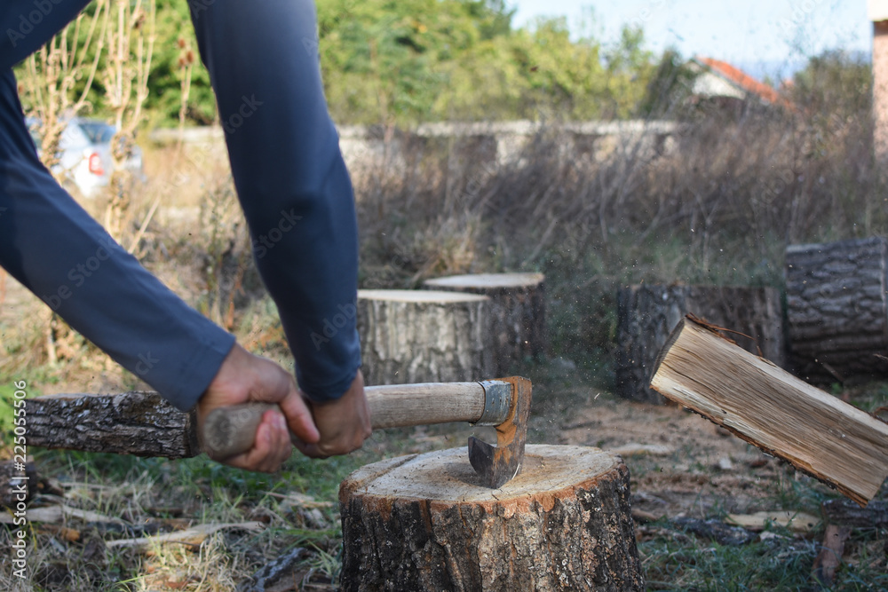 Lumberjack chopping wood for winter, Young man chopping woods with old ax