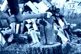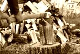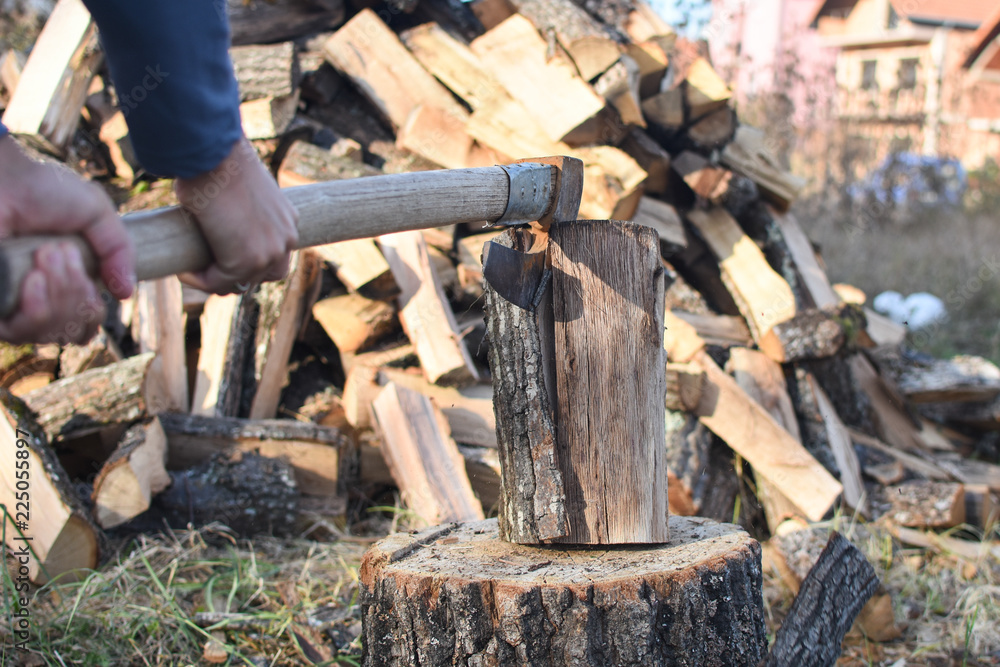 Lumberjack chopping wood for winter, Young man chopping woods with old ax