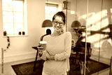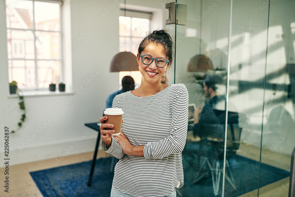 Smiling Asian businesswoman drinking coffee by an office boardro