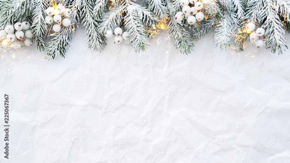 Christmas and New Year holiday background. Xmas greeting card. Spruce tree on white creased background.