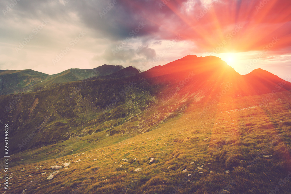 Scenic view of mountains, autumn landscape with colorful hills at sunset. Filtered image:cross processed vintage effect.