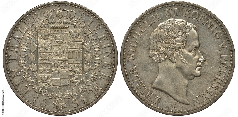 Germany German silver coin one thaler 1831, Land Prussia, crowned shield with numerous elements surrounded by collar of the order, date below, King Friedrich Wilhelm III head right,