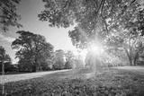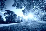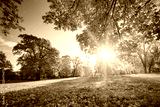 trees with multicolored leaves on the grass in the park. Maple foliage in sunny autumn. Sunlight in early morning in forest