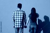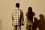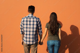 Young man and pretty lady keeping hands together during communication while turning back to camera opposite orange wall