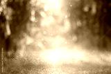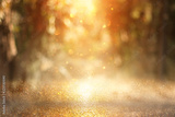blurred abstract photo of light burst among trees and glitter golden bokeh lights.