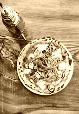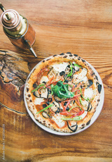 Summer dinner or lunch. Flat-lay of freshly baked Italian vegetarian pizza with vegetables and fresh basil and teapot over rustic wooden background, top view