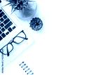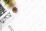 Modern white office desk table with laptop and supplies. Top view with copy space, flat lay.