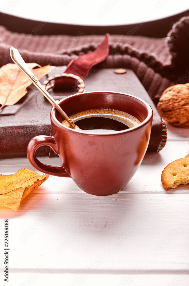 Cup coffee with book in leather binding autumn dry leaf and warm