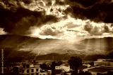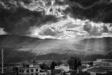 Rays of light go through the clouds illuminating the town of Chaouen on a rainy day