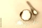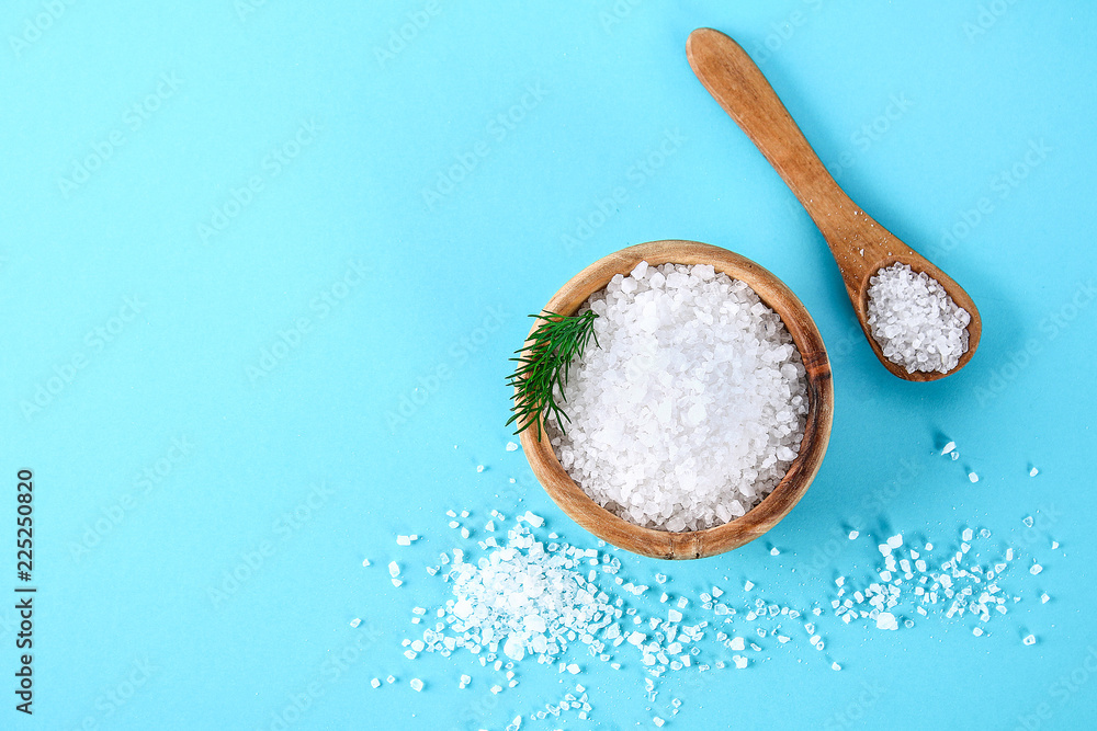 Crystals of large sea salt in a wooden bowl and spoon and dill on a blue table.