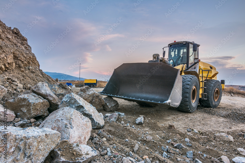 Excavators and heavy machinery in the works of stone movement in a quarry stone extraction for its transformation into gravel