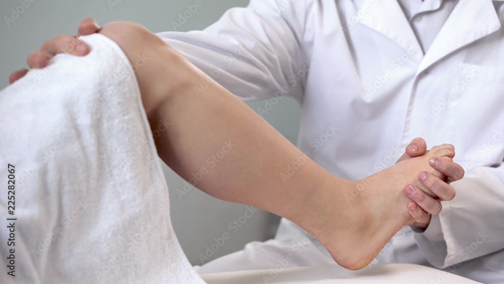 Traumatologist examining patient foot, patient receiving first aid in clinic