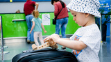 Portrait of 2 years old boy playing with small wooden airplane in airport terminal