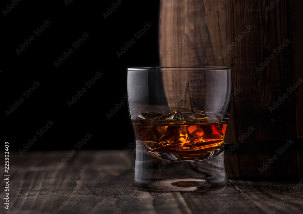 Glass of whiskey with ice cubes next to wooden barrel. Cognac brandy drink