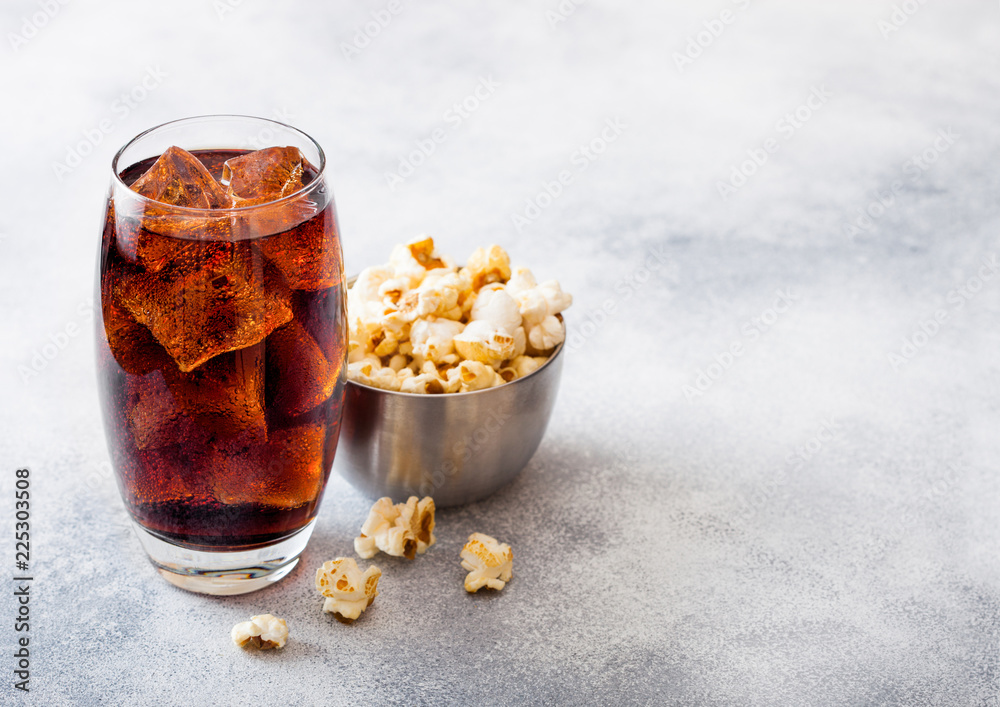 Glass of cola soda drink with ice cubes and steel bowl of popcorn snack on stone kitchen table background.