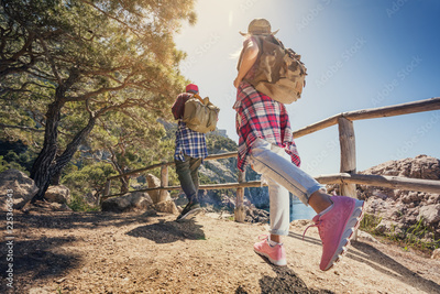 A woman and a man walking a path in a mountain forest. View from the back. Legs in sneakers close-up. Hiking shoes.
