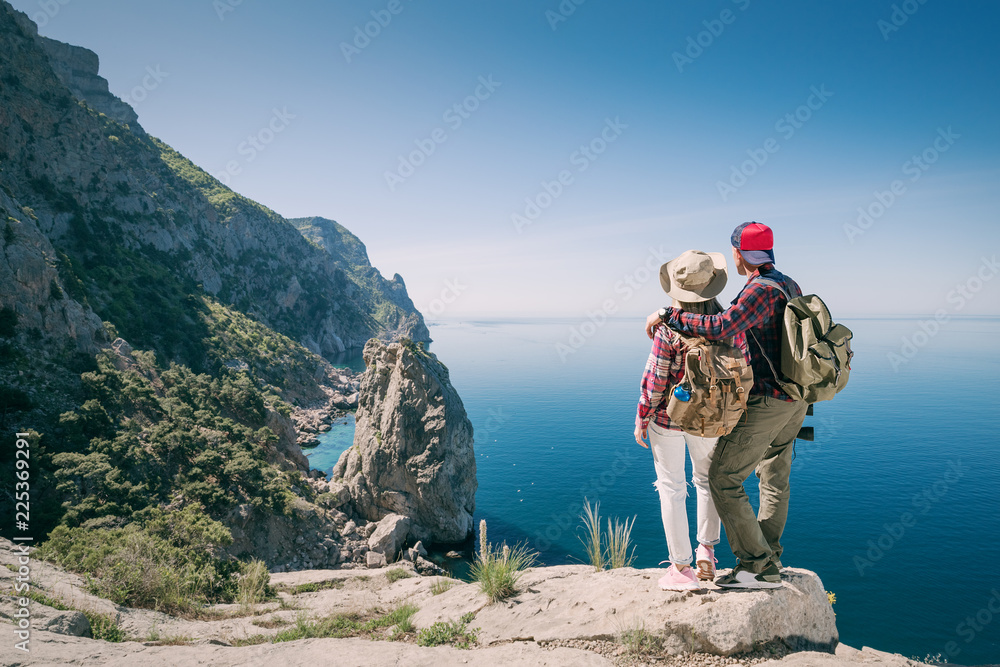 Couple Travelers Man and Woman in the Mountains look at the Sea. Young family hikers with backpacks outdoors. Freedom and active lifestyle concept.
