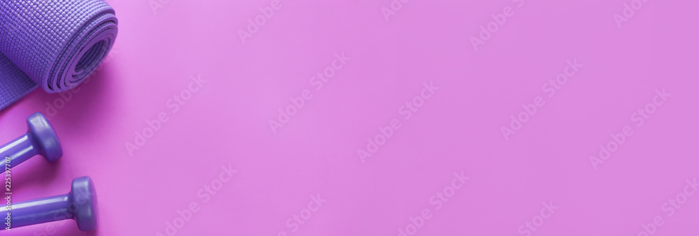 Banner of fitness concept with dumbbells, and a mat, on a pink background.