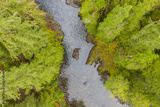 Aerial drone view of a wild river running through a forest