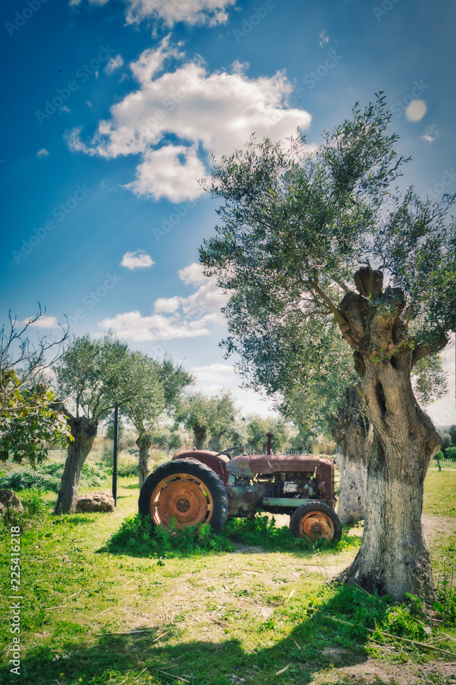 Very old tractor among trees