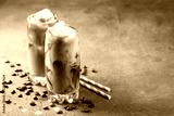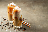 Ice coffee in a tall glass with cream poured over and coffee beans. Cold summer drink on a brown rusty background with copy space