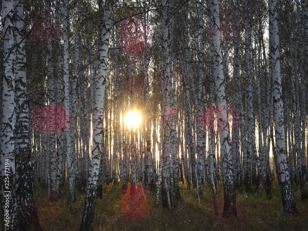 Sunset through autumn birch forest. Texture of birch trunks, solid forest.
