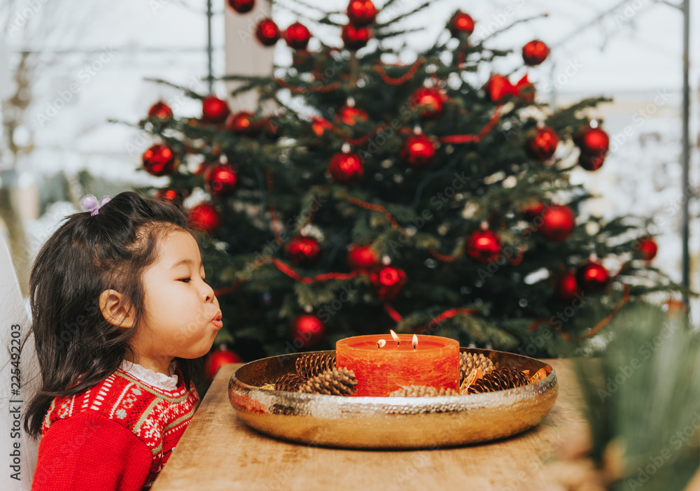 Adorable 3 year old toddler girl enjoying Christmas time, playing with candles