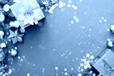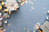 Christmas gifts on blue background top view. Merry Christmas greeting card, banner. Winter xmas holiday theme. Happy New Year.