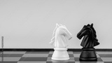 white and black horse chess stand encounter on a chessboard. - Business winner and fight concept.