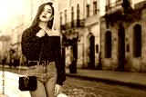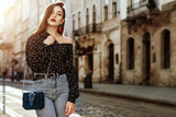 Outdoor portrait of yong beautiful fashionable woman wearing stylish black white polka dot blouse, blue jeans, red earrings, with small quilted bag. Model posing in street of european city. Copy space