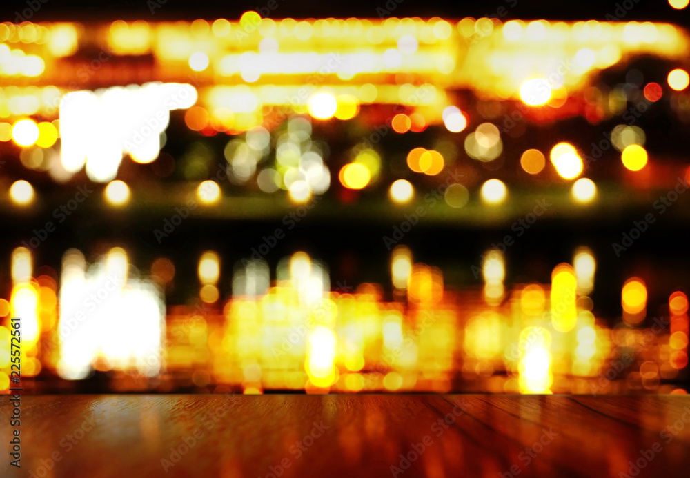 top of wood table with orange and yellow bokeh light in the dark night on bar pub for party festive background