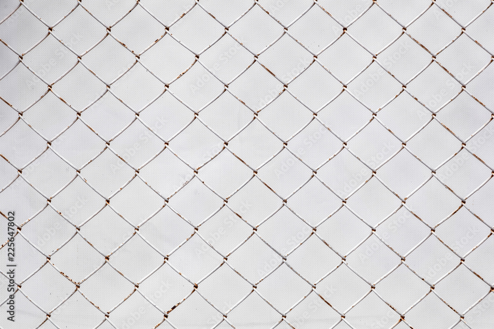 Close-up white wall covered with mellaic grating. Texture cage metal net on isolate on white background with clipping path