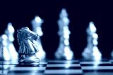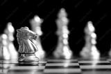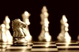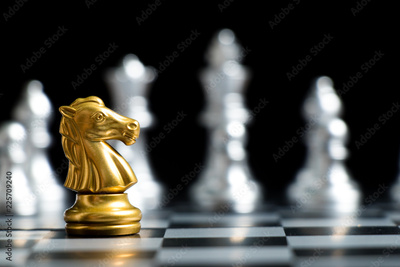 Gold knight chess piece face with silver team on black background (Concept for company strategy, business decision and encounter the problem)