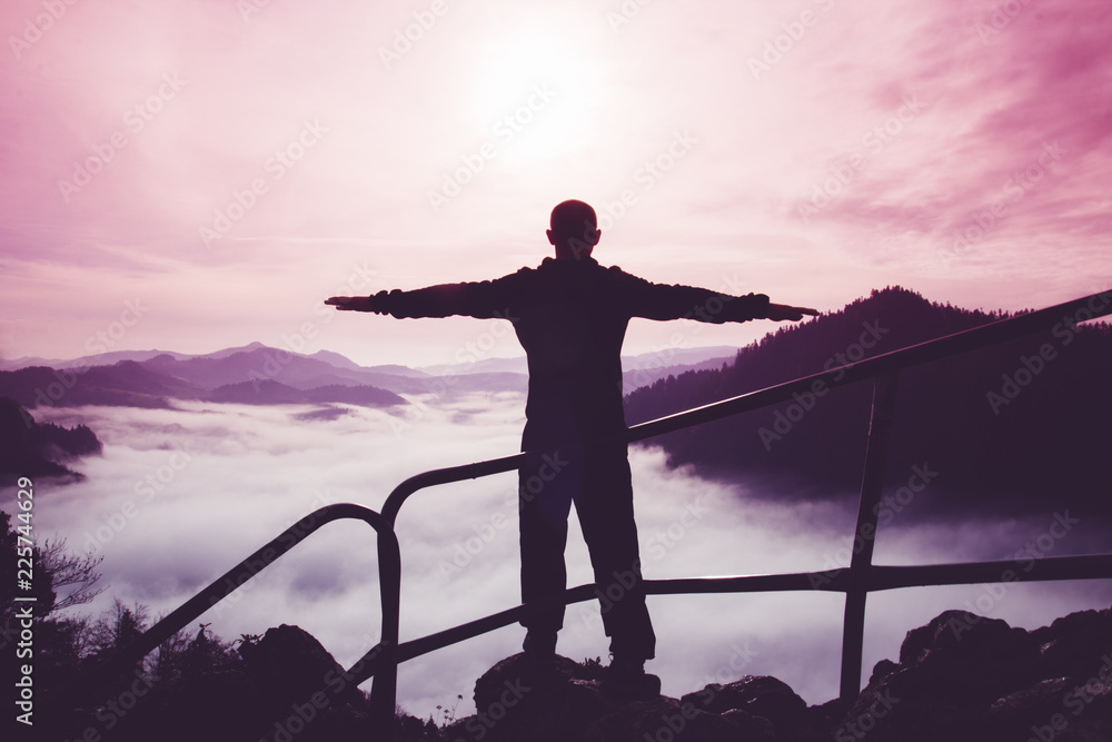 The silhouette of a single man with arms apart standing on top of a mountain against a surreal purple and red mountain landscape, concept of inspiration, enthusiasm and aspiration
