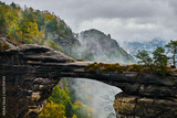 Misty foggy landscape of the Pravcicka gate (Pravcicka brana) the largest natural sandstone arch in Europe in Czech Switzerland (Bohemian Switzerland or Ceske Svycarsko) National Park