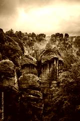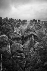 Misty fog mountains from viewpoint of Bastei in Saxon Switzerland, Germany to the mountains at sunrise in the morning fog, National park Saxon Switzerland