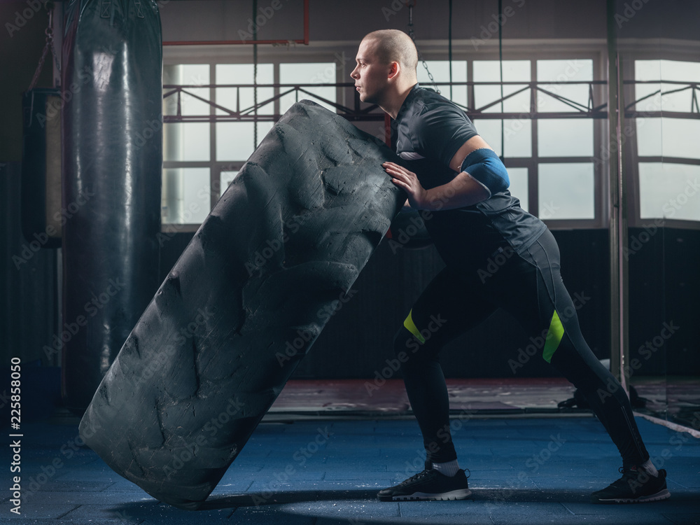 The man turns the tire, crossfit functional sport. Young guy exercising with a wheel sports functional training in the gym.
