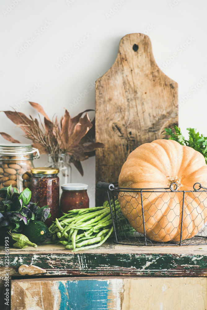 Autumn seasonal food ingredients, kitchen utensils. Vegetables, pumpkin, canned food, fallen leaves over rustic wooden chest of cupboard, vertical composition Thanksgiving dinner preparation